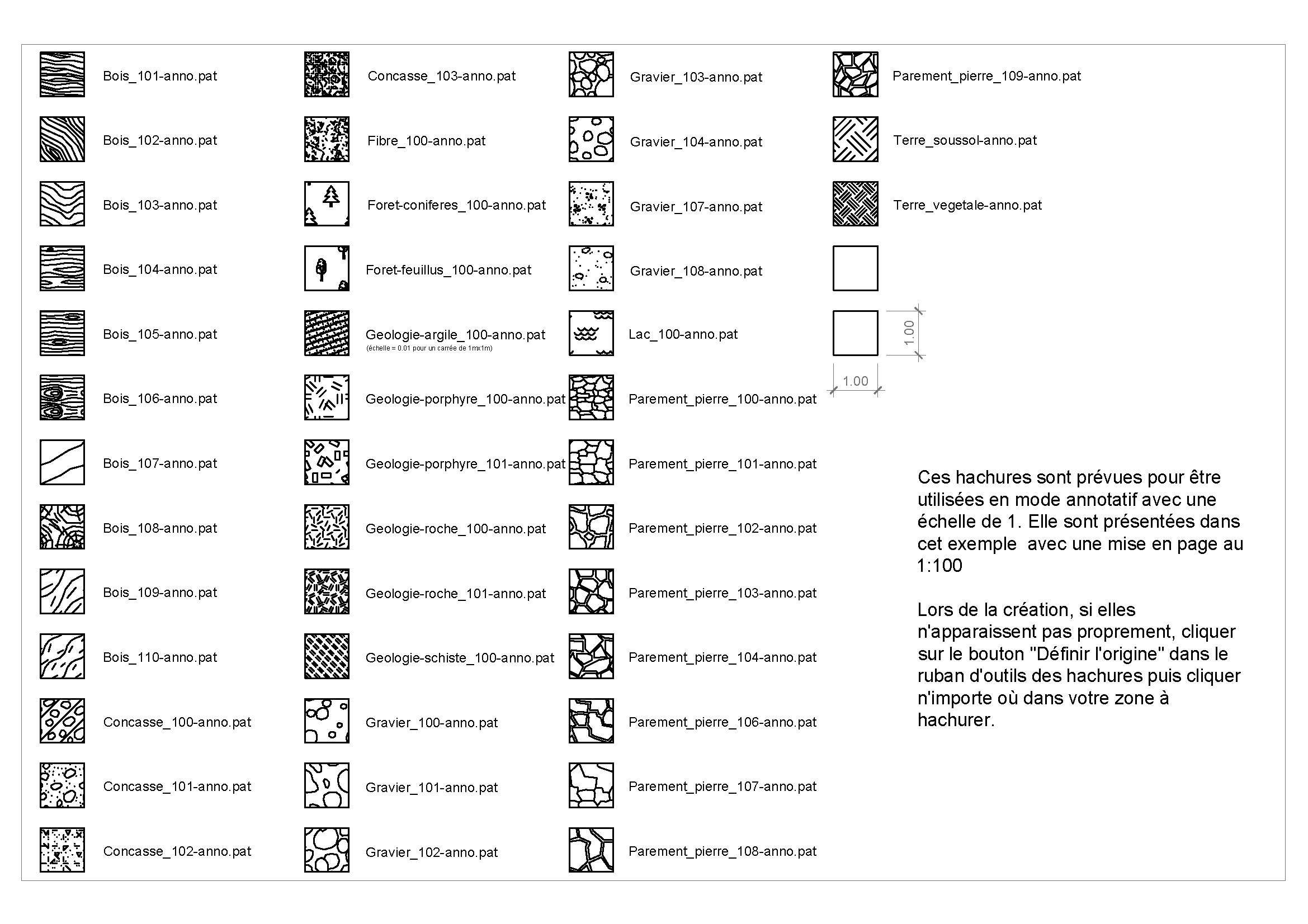 - Le répertoire que vous avez créé contient également un fichier AutoCAD et un PDF avec un exemple au 1:100 des hachures proposées ici.